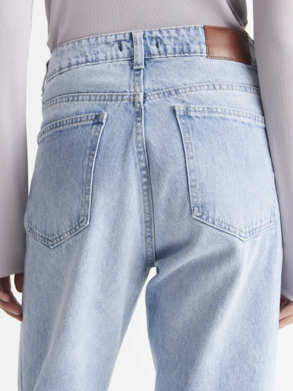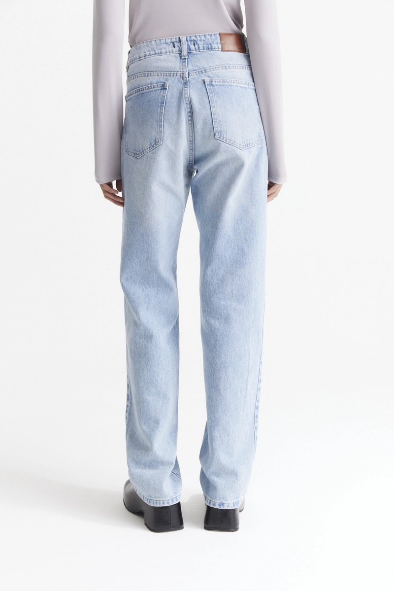 Jean recto celeste clásico, tiro alto. Esta localizado y tiene bigotes. Confeccionado en denim rígido, algodón 100%